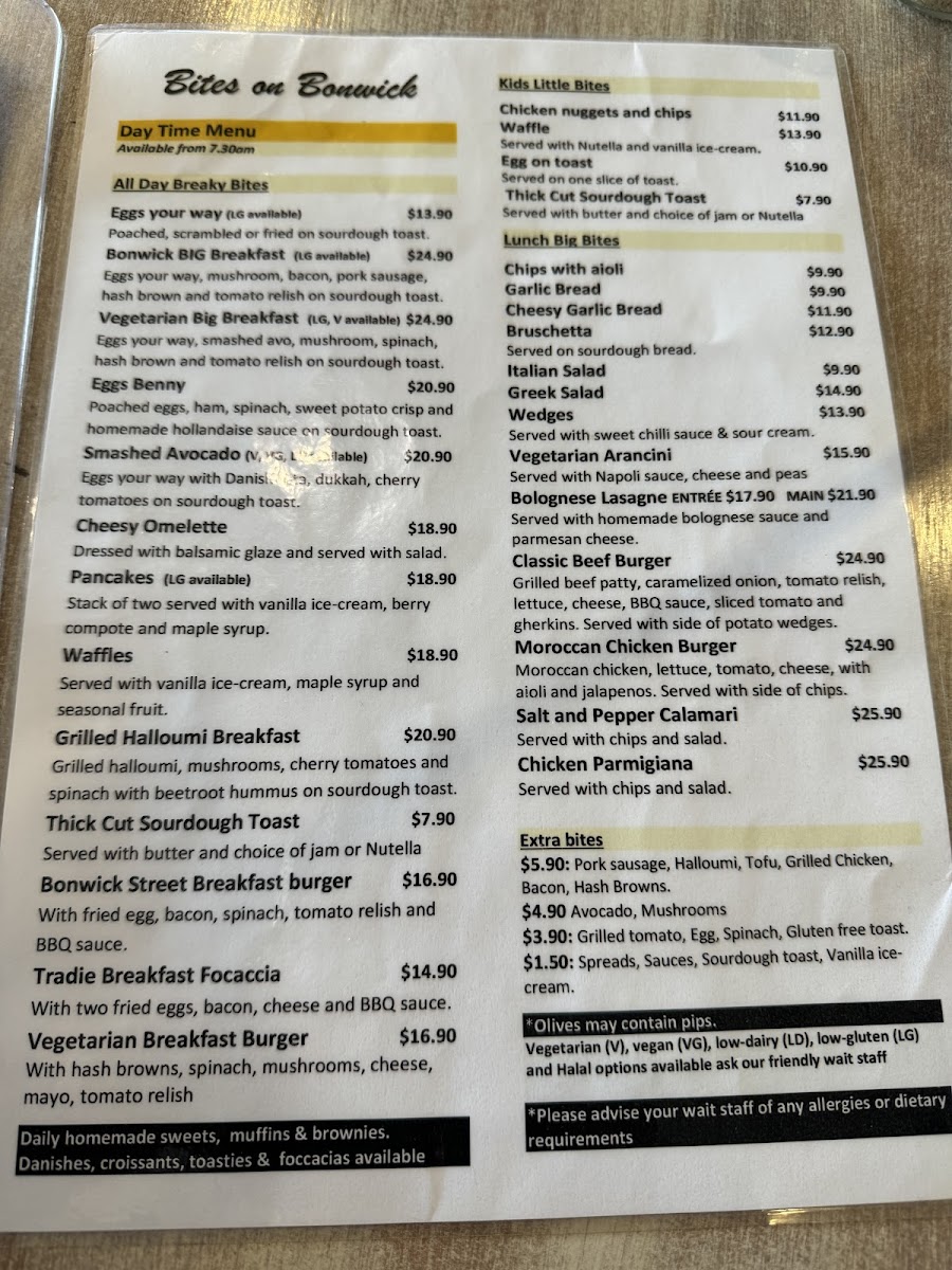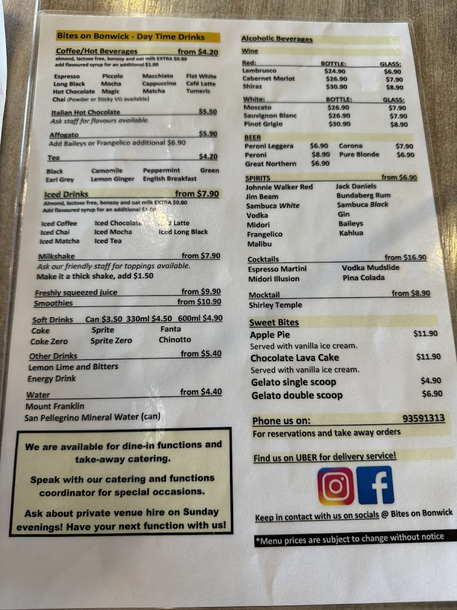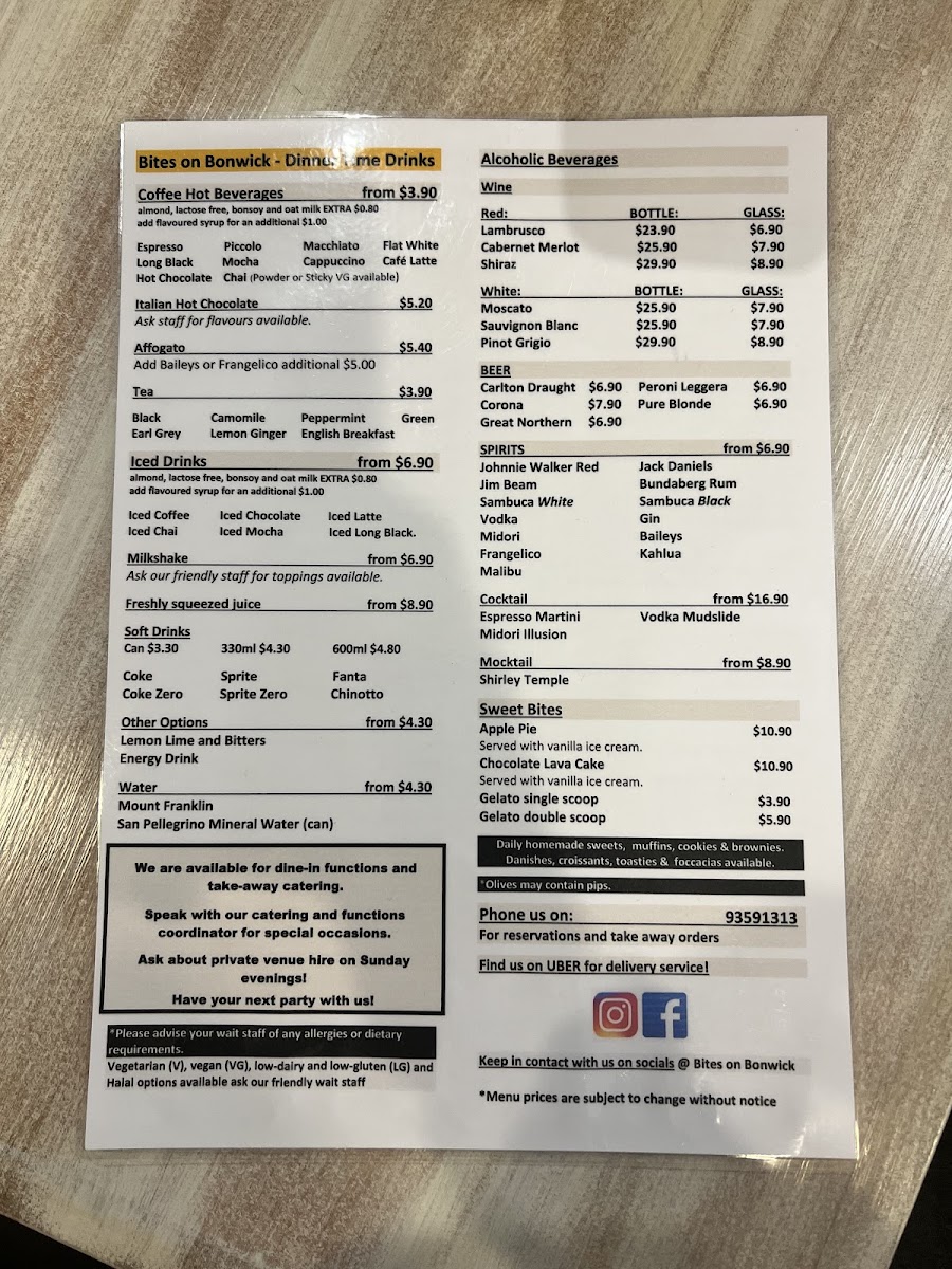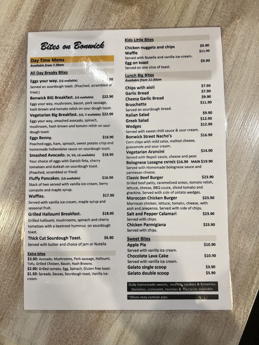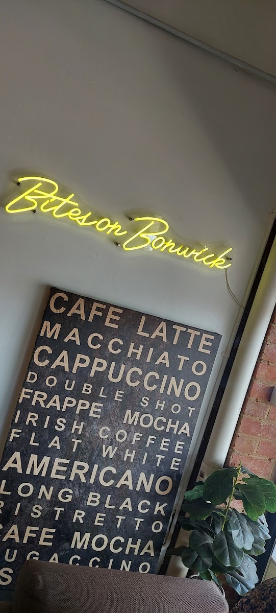 The menu at Bites on Bonwick features a variety of options that cater to breakfast, lunch, and casual dining needs. It includes a selection of classic breakfast dishes such as Eggs Benedict, Scrambled Eggs and Toast, Smashed Avocado, and Fluffy Pancakes, suitable for morning or brunch visits. Coffee and specialty drinks like Chai Latte are also available to complement lighter meals or coffee breaks.