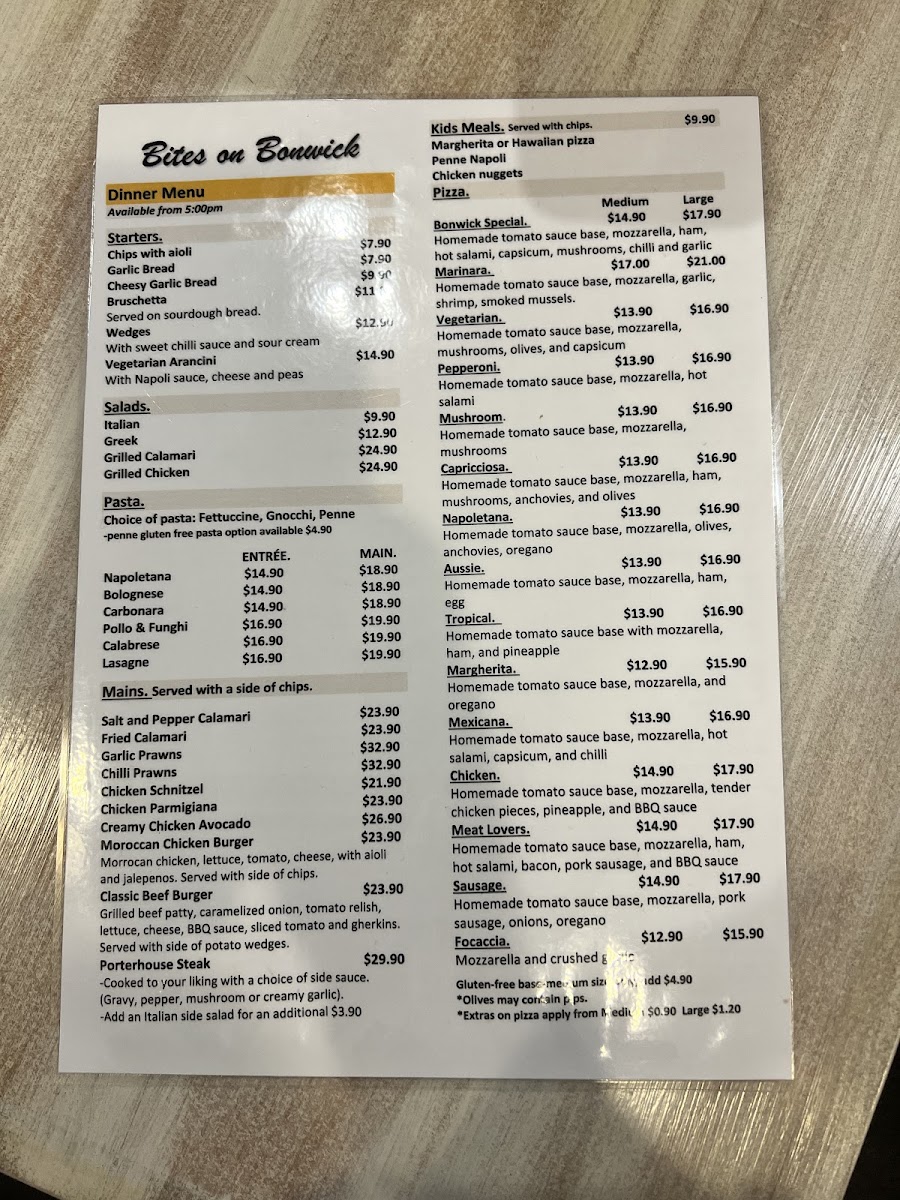 Pizza selections include traditional varieties such as Margherita, Sausage, Tropical, Capricciosa, and the Bonwick Special, which all feature a tomato sauce base and various toppings to suit different preferences.